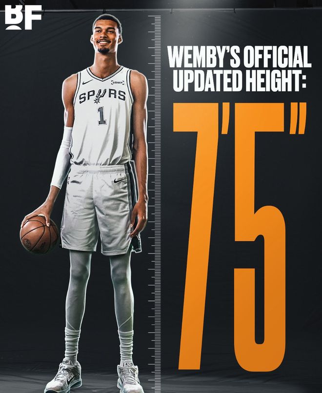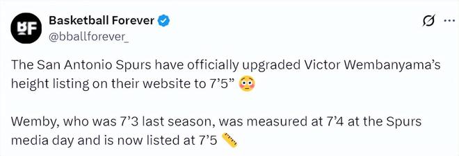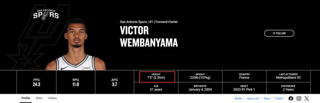 根据美媒BF的消息,马刺队官方网站上文班亚马的身高数据已经更新为7尺5寸!上赛季文班亚马的身高是7尺3,在马刺媒体日的身高测量是7尺4,如今他的身高被更新为7尺5。(美媒发表了一个目瞪口呆的表情)