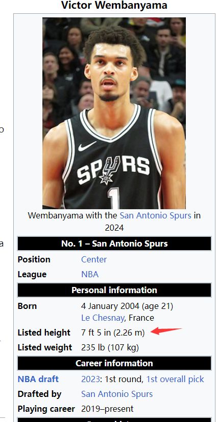 维基百科上文班亚马的身高数据也已经更新为7尺5(2.26米),体重为235磅(107公斤),看起来文班亚马是真的又长高了。