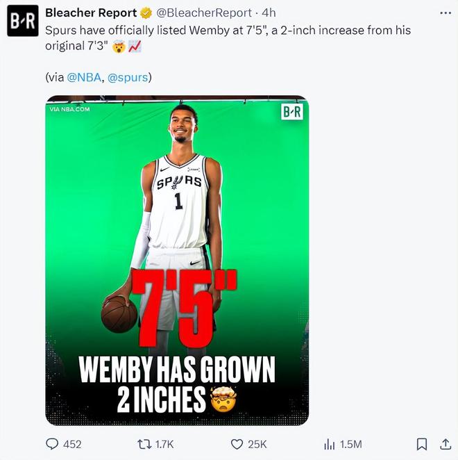 就在9天之前,NBA媒体日马刺队官方公布的季前赛名单中,文班亚马的身高还是7尺4寸,体重240磅,短短9天文班亚马就从7尺4长到7尺5?9天长了2厘米,这你们觉得可能吗?