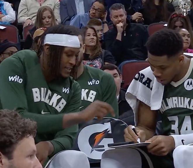 赛后采访时,记者问到:“大概第三节,你和字母哥一起坐在场边,画着战术板,好像在讨论东西。你们一起讨论场上的位置还是别的,当时的具体对话是什么?”