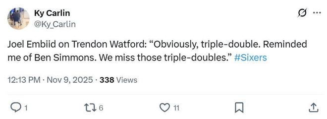 沃特福德的三双表现更是勾起了恩比德的美好回忆,赛后直言:“是的,他做到了,他让我想起了本西蒙斯,怀念那些三双。”