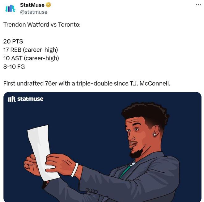 也让其成为76人队史自TJ-麦康奈尔后,首位能够砍下三双的落选秀。