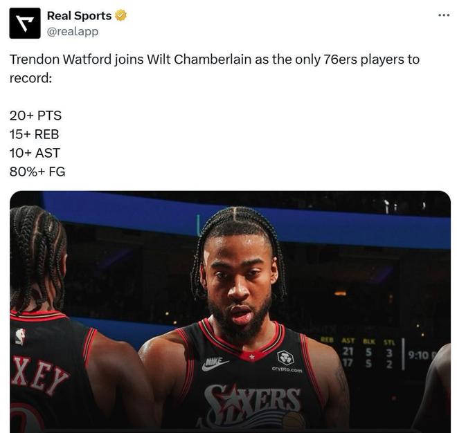 全场10中8的高效表现让沃特福德成为76人队队史第二位能够以80%命中率至少拿下20分15篮板10助攻的球员,第一位是“大帅”张伯伦。